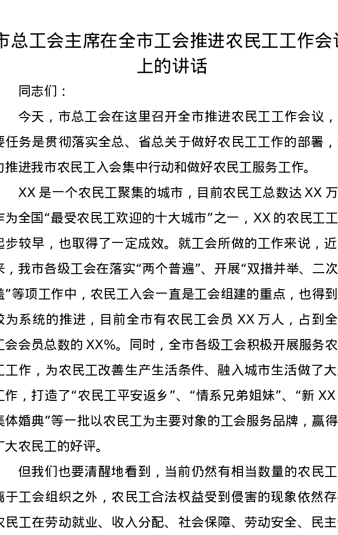 市总工会主席在全市工会推进农民工工作会议上的讲话