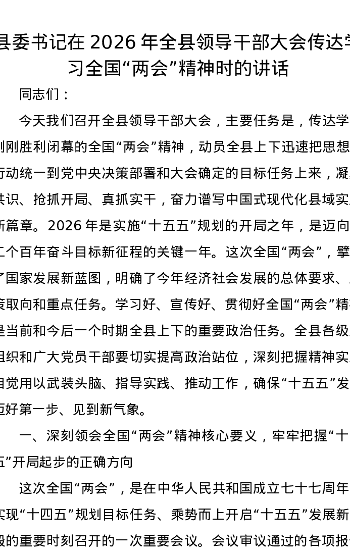 县委书记在2026年全县领导干部大会传达学习全国两会精神时的讲话