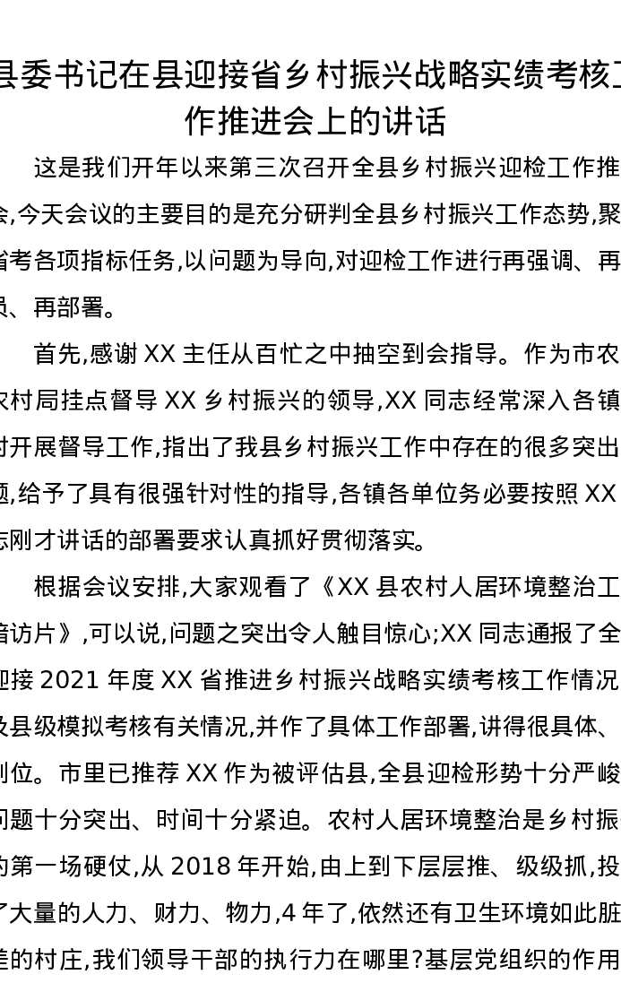县委书记在县迎接省乡村振兴战略实绩考核工作推进会上的讲话