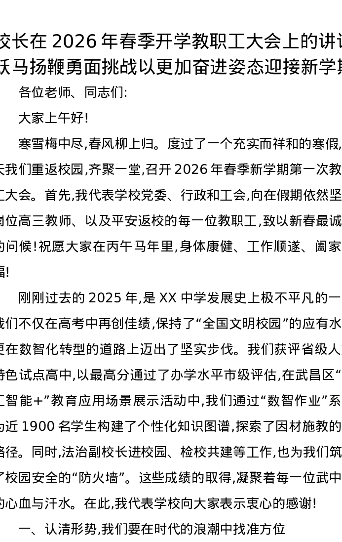 校长在2026年春季开学教职工大会上的讲话:跃马扬鞭勇面挑战以更加奋进姿态迎接新学期