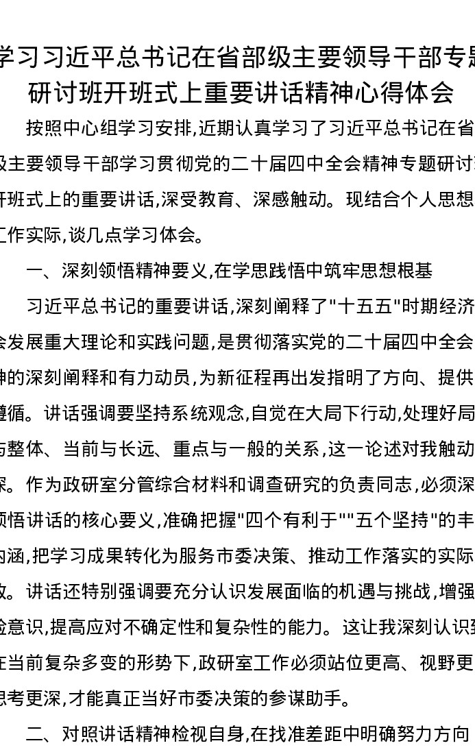 学习习近平总书记在省部级主要领导干部专题研讨班开班式上重要讲话精神心得体会