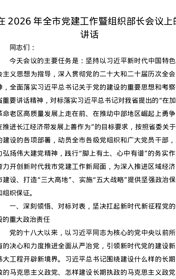 在2026年全市党建工作暨组织部长会议上的讲话