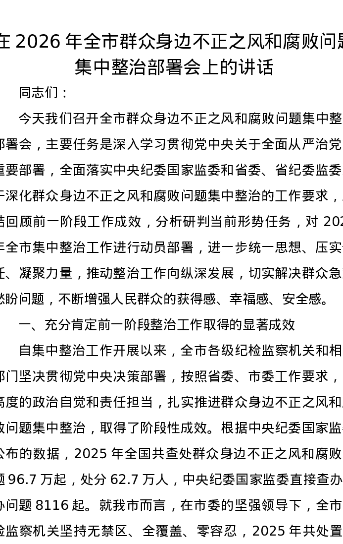 在2026年全市群众身边不正之风和腐败问题集中整治部署会上的讲话