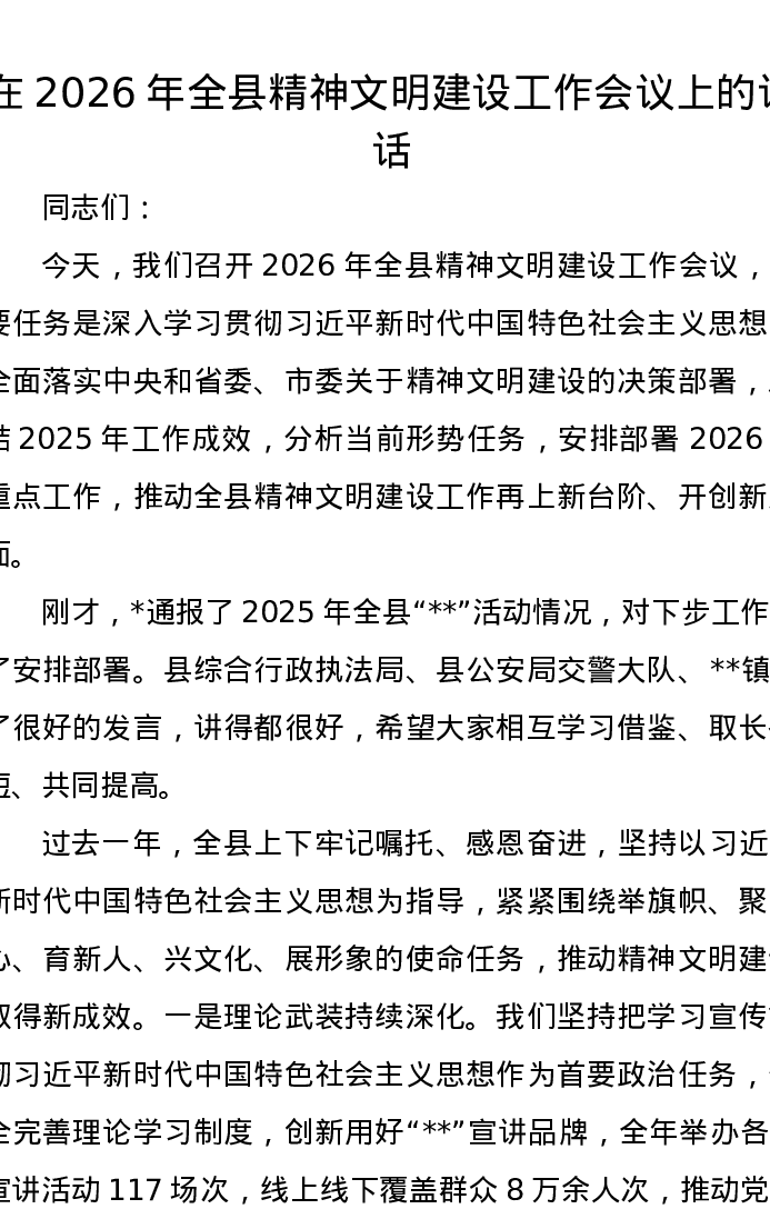 在2026年全县精神文明建设工作会议上的讲话
