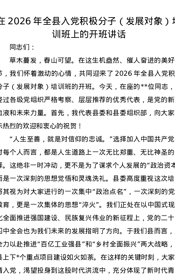 在2026年全县入党积极分子(发展对象)培训班上的开班讲话