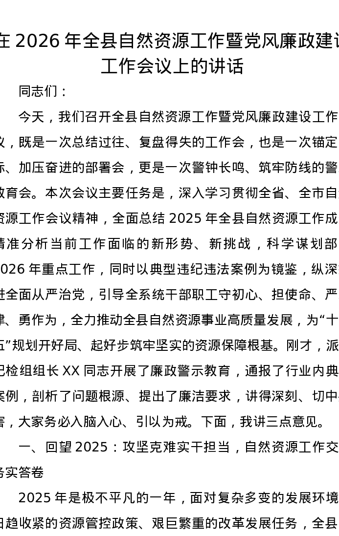 在2026年全县自然资源工作暨党风廉政建设工作会议上的讲话