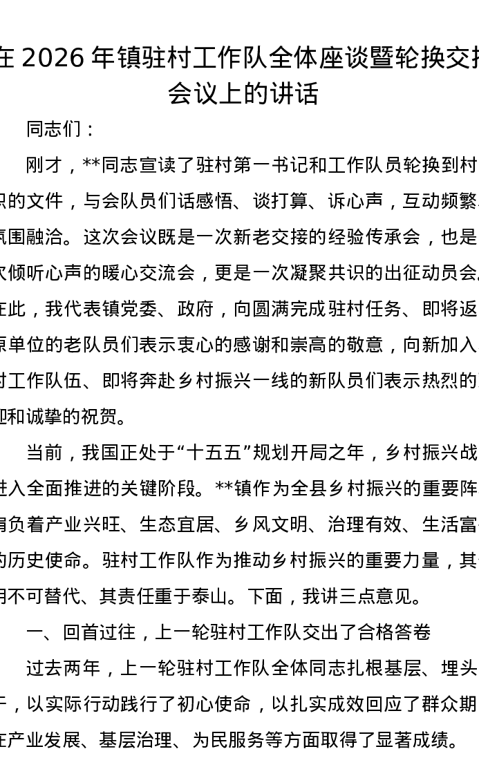 在2026年镇驻村工作队全体座谈暨轮换交接会议上的讲话