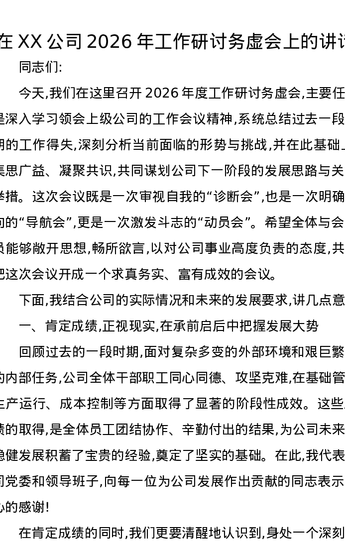 在XX公司2026年工作研讨务虚会上的讲话