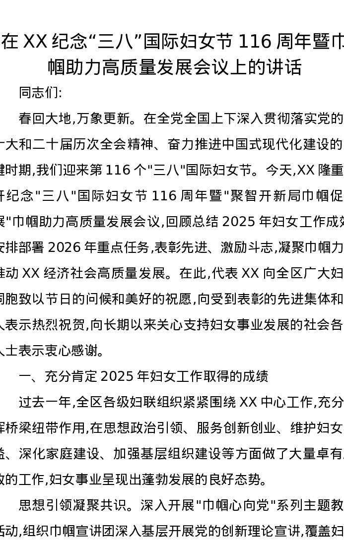 在XX纪念三八国际妇女节116周年暨巾帼助力高质量发展会议上的讲话