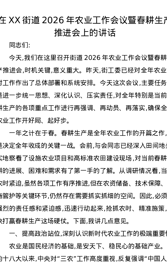 在XX街道2026年农业工作会议暨春耕生产推进会上的讲话