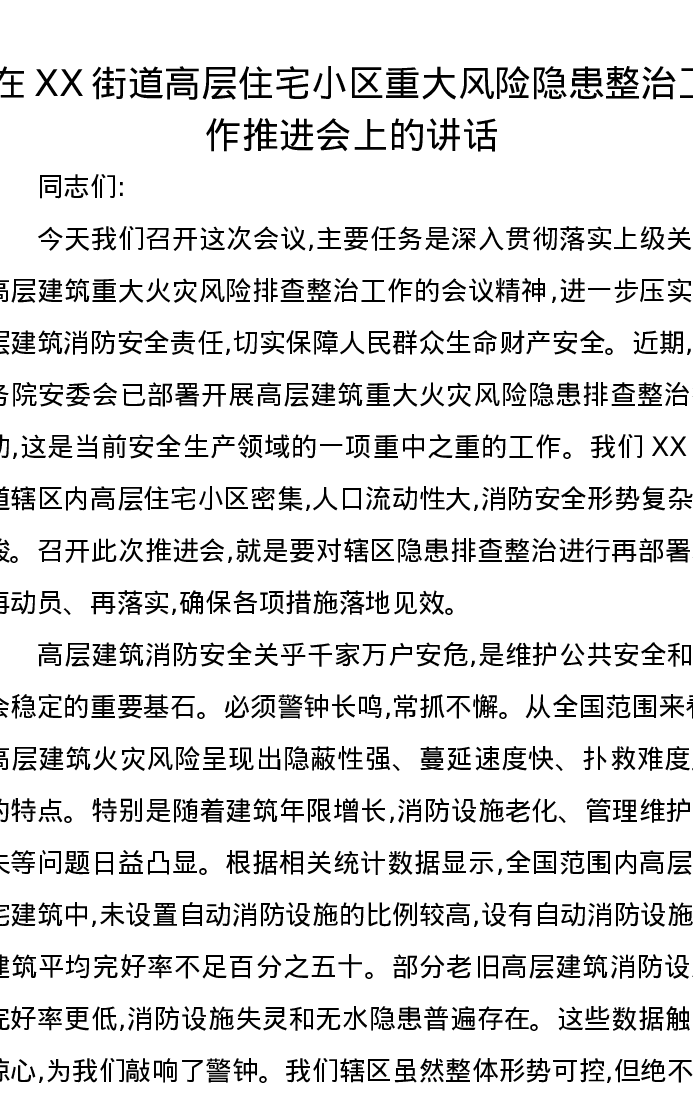在XX街道高层住宅小区重大风险隐患整治工作推进会上的讲话
