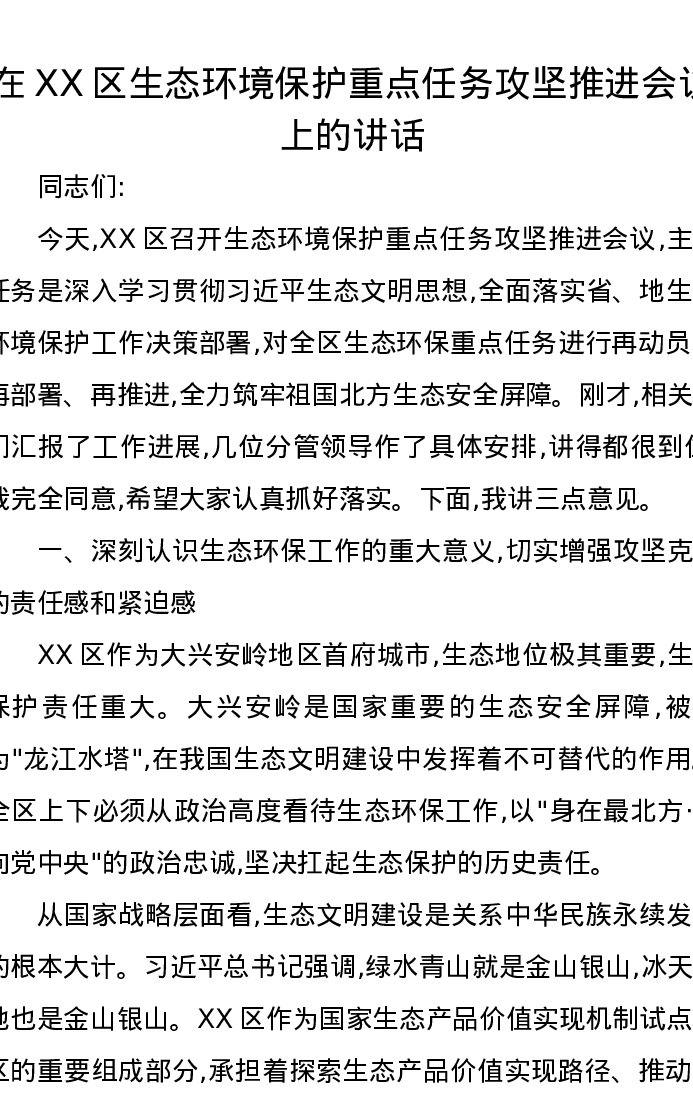 在XX区生态环境保护重点任务攻坚推进会议上的讲话