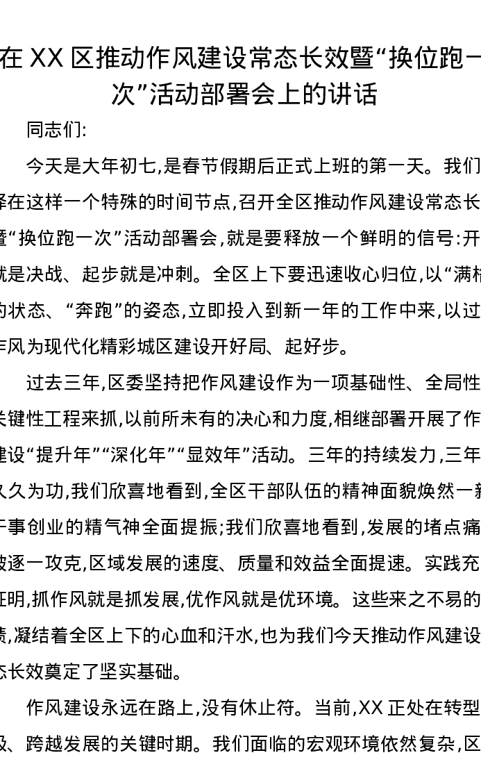 在XX区推动作风建设常态长效暨换位跑一次活动部署会上的讲话