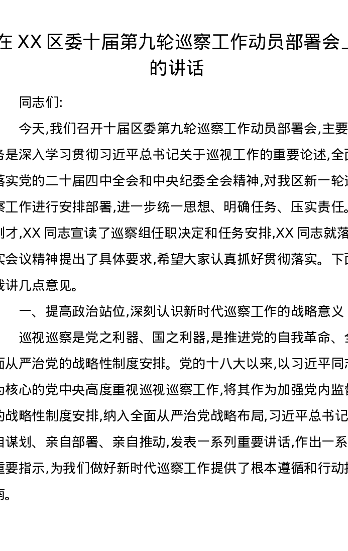 在XX区委十届第九轮巡察工作动员部署会上的讲话