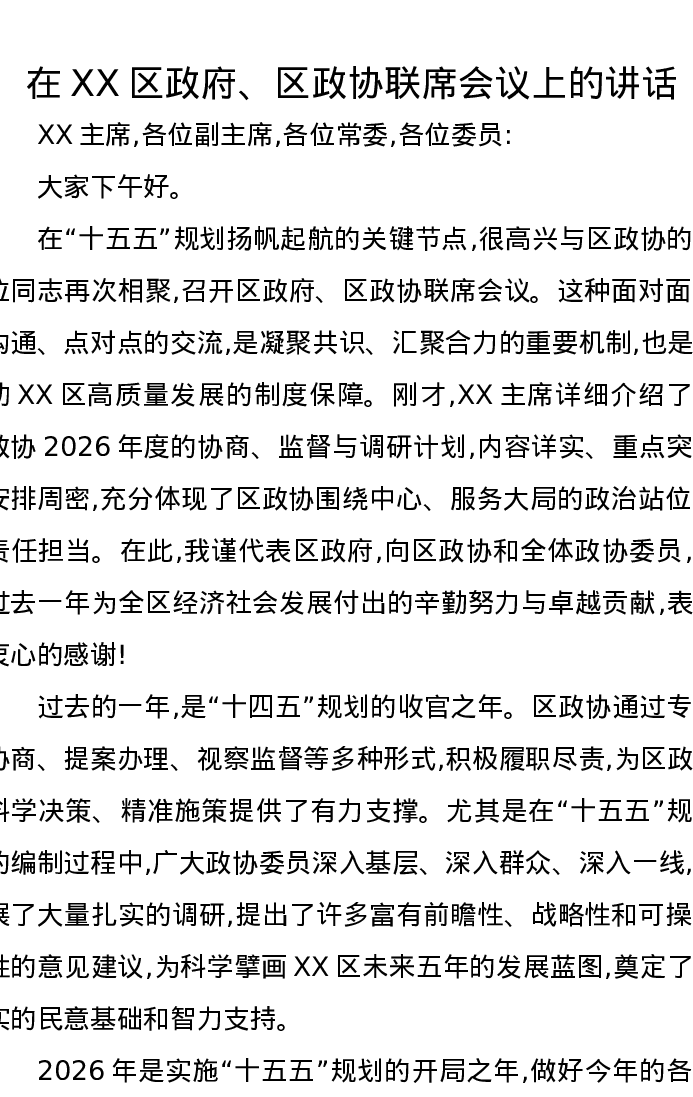 在XX区政府、区政协联席会议上的讲话