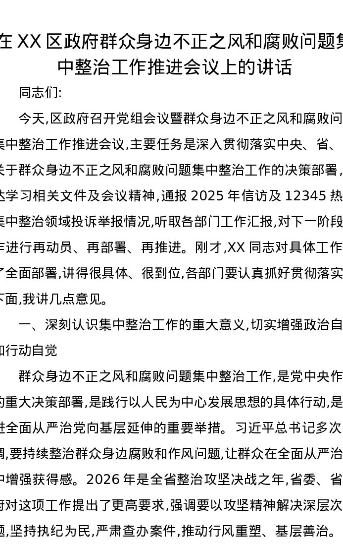 在XX区政府群众身边不正之风和腐败问题集中整治工作推进会议上的讲话