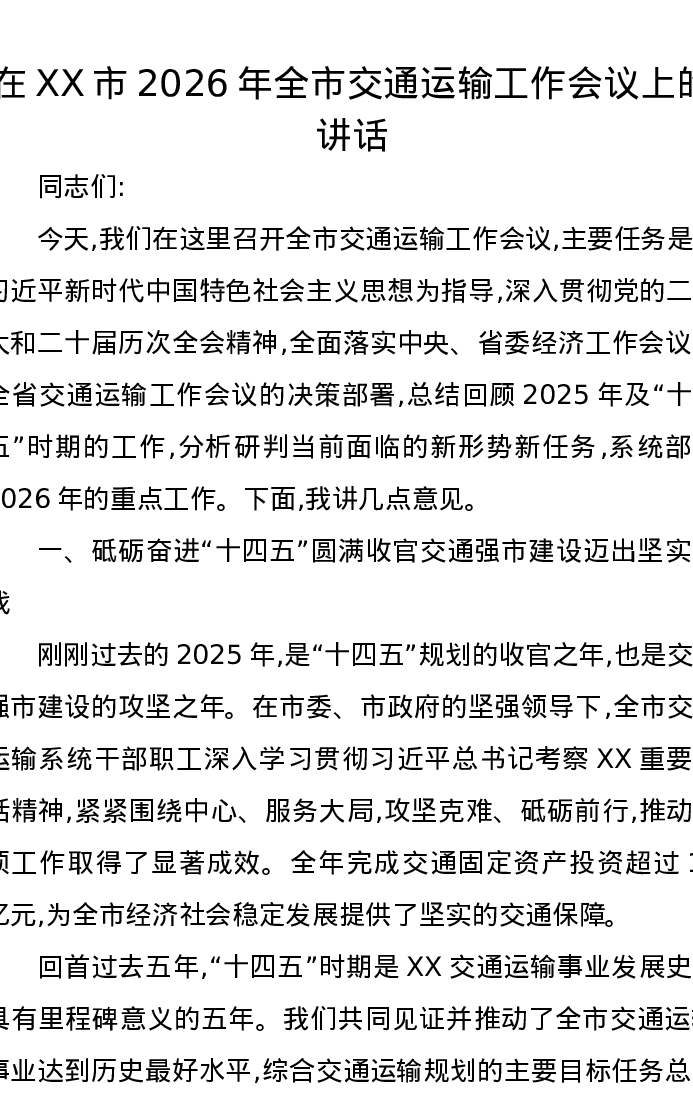 在XX市2026年全市交通运输工作会议上的讲话2