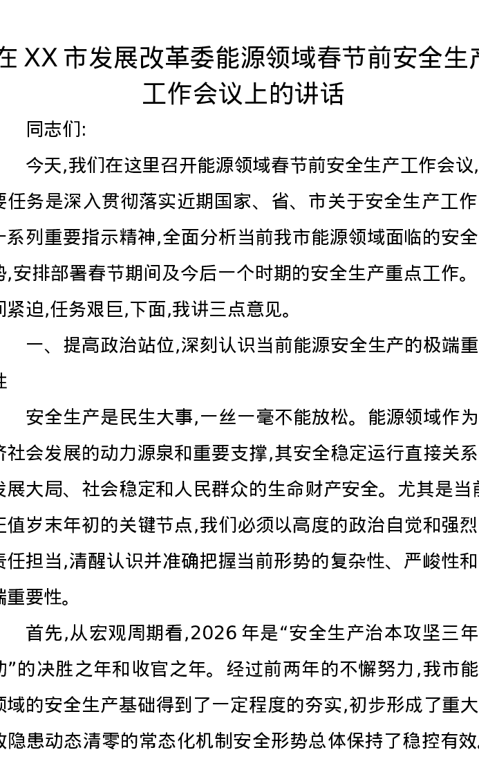 在XX市发展改革委能源领域春节前安全生产工作会议上的讲话
