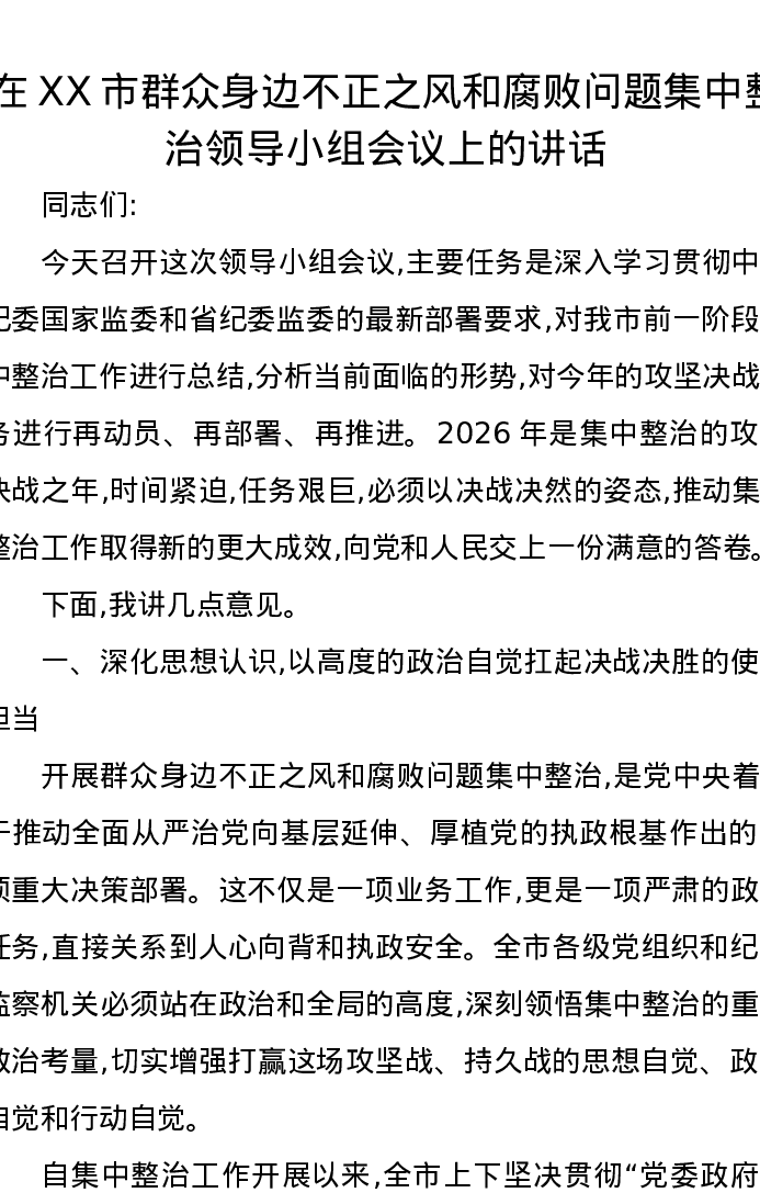 在XX市群众身边不正之风和腐败问题集中整治领导小组会议上的讲话2