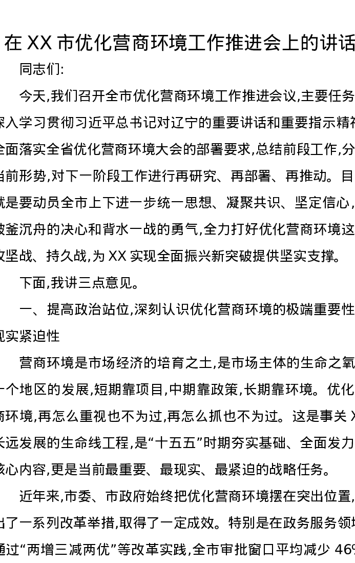 在XX市优化营商环境工作推进会上的讲话3