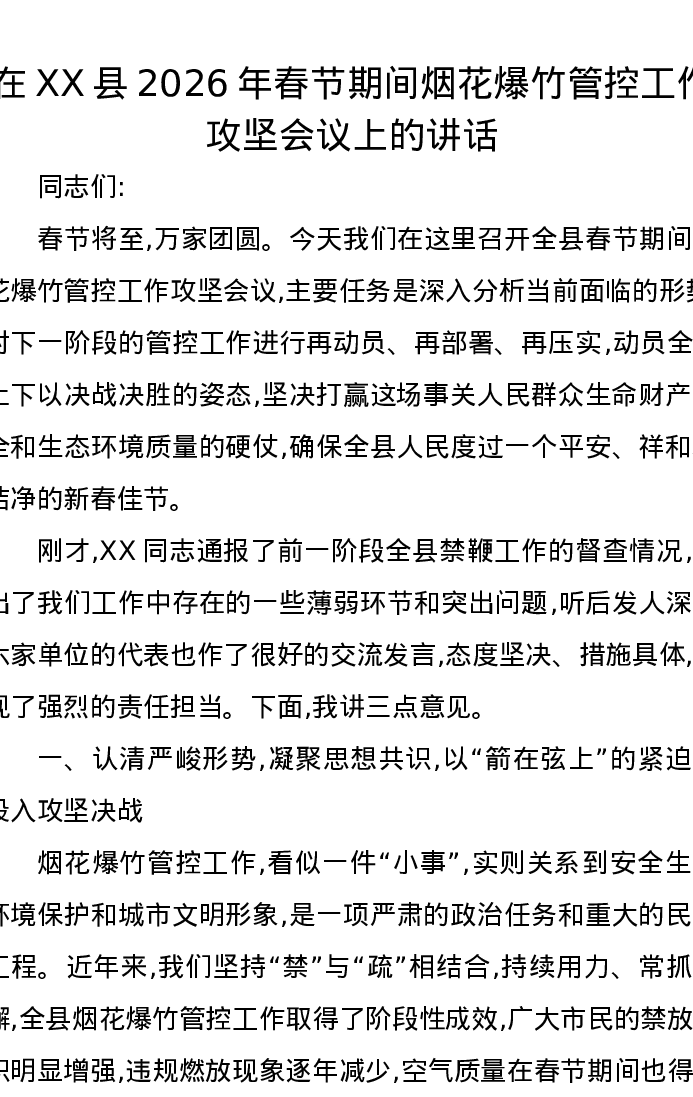 在XX县2026年春节期间烟花爆竹管控工作攻坚会议上的讲话