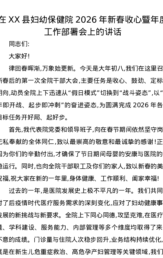 在XX县妇幼保健院2026年新春收心暨年度工作部署会上的讲话