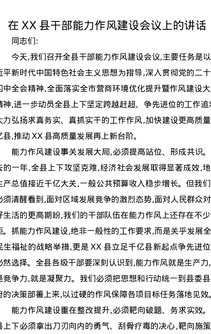 在XX县干部能力作风建设会议上的讲话