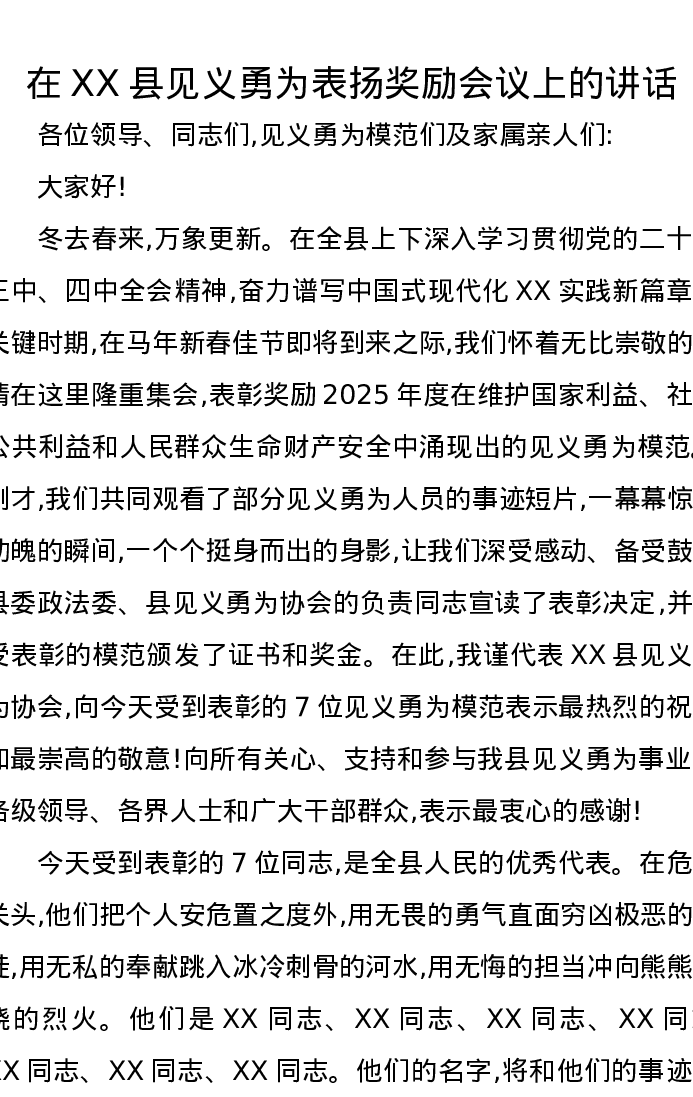 在XX县见义勇为表扬奖励会议上的讲话