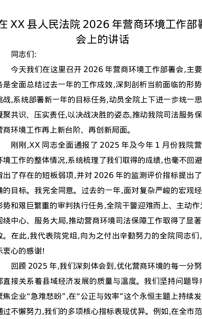 在XX县人民法院2026年营商环境工作部署会上的讲话