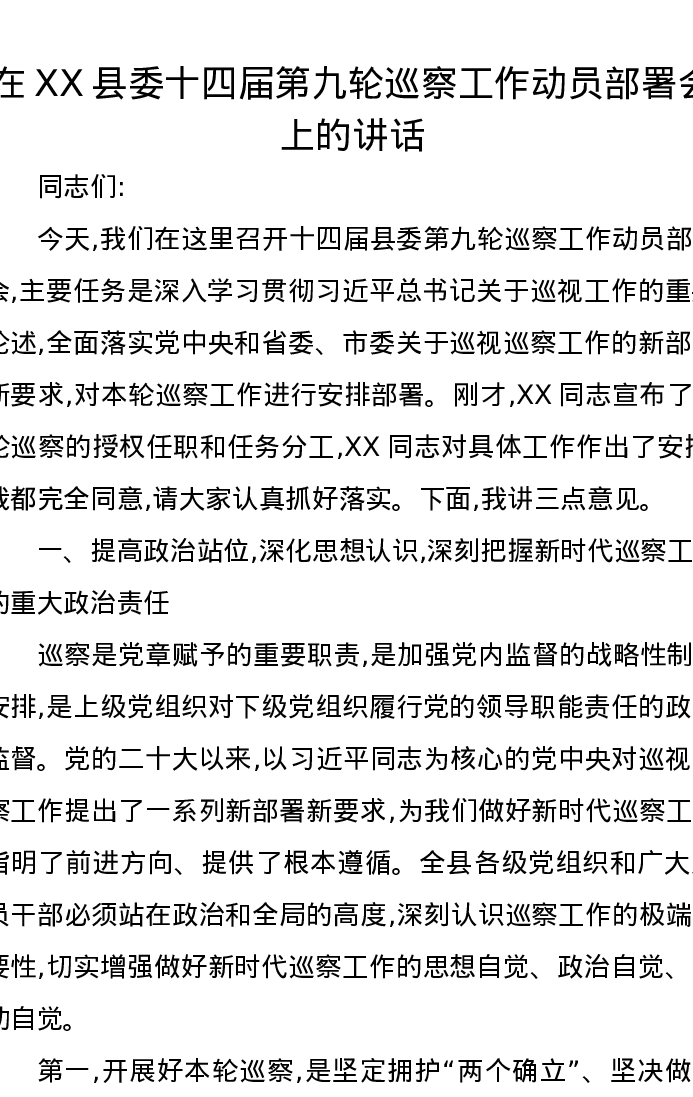 在XX县委十四届第九轮巡察工作动员部署会上的讲话