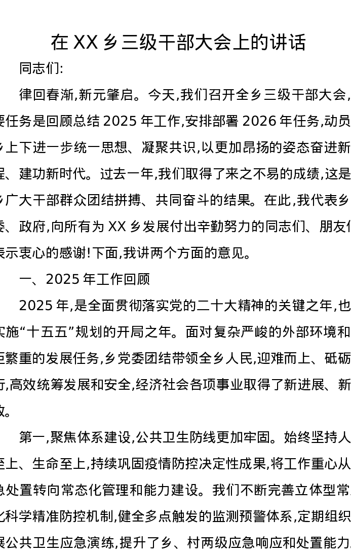 在XX乡三级干部大会上的讲话
