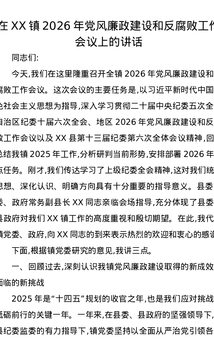 在XX镇2026年党风廉政建设和反腐败工作会议上的讲话