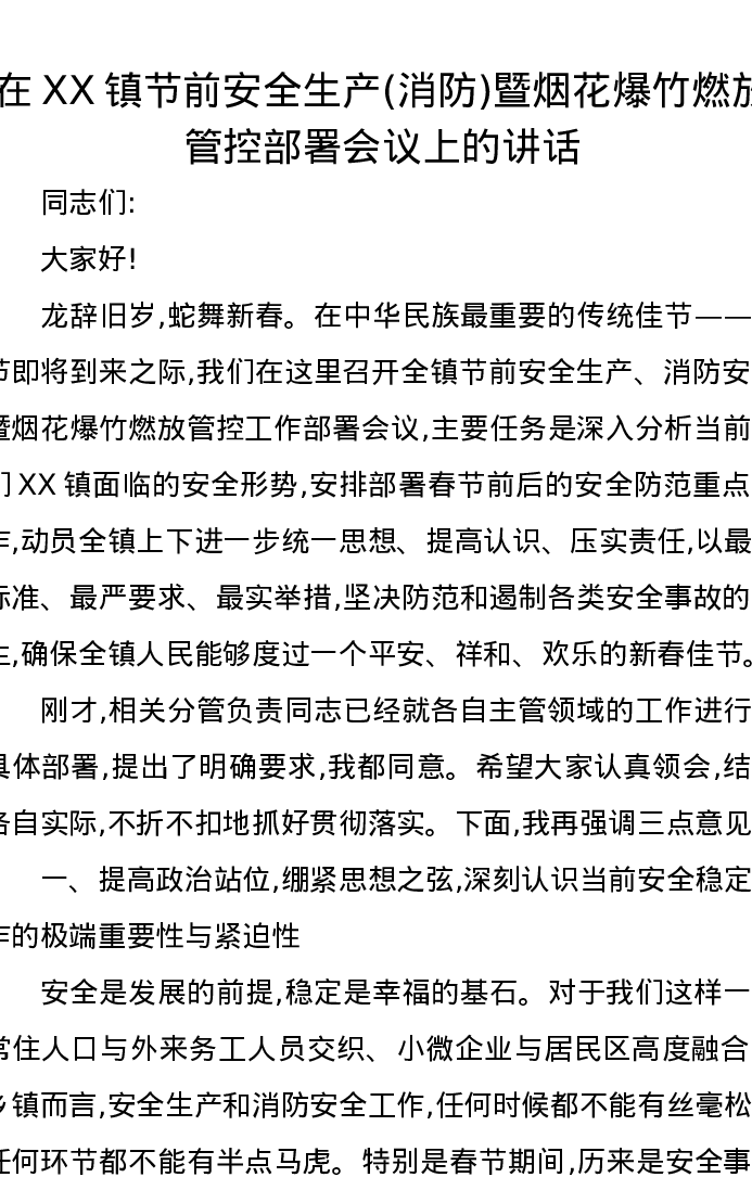 在XX镇节前安全生产(消防)暨烟花爆竹燃放管控部署会议上的讲话