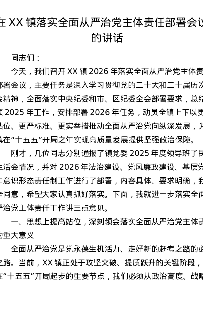 在XX镇落实全面从严治党主体责任部署会议上的讲话