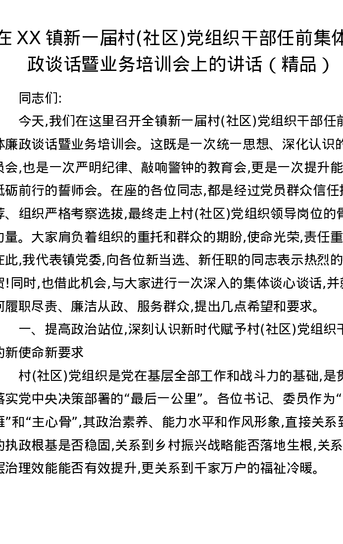 在XX镇新一届村(社区)党组织干部任前集体廉政谈话暨业务培训会上的讲话