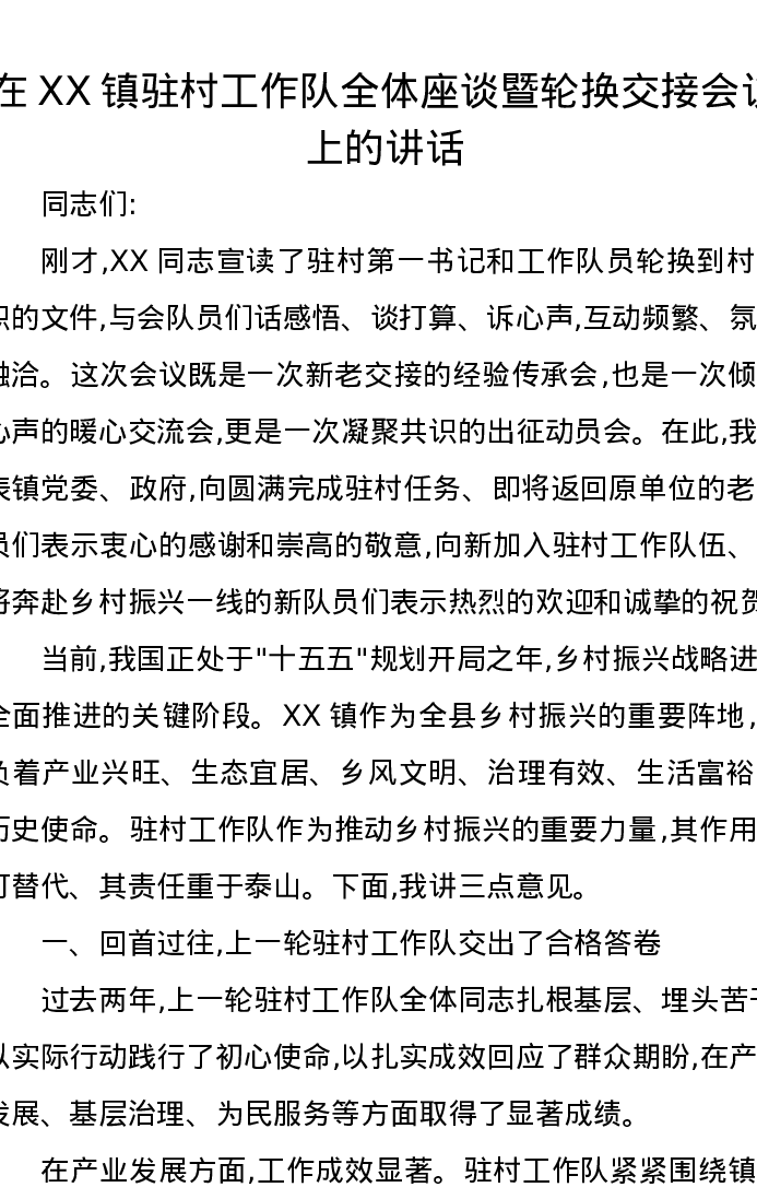 在XX镇驻村工作队全体座谈暨轮换交接会议上的讲话