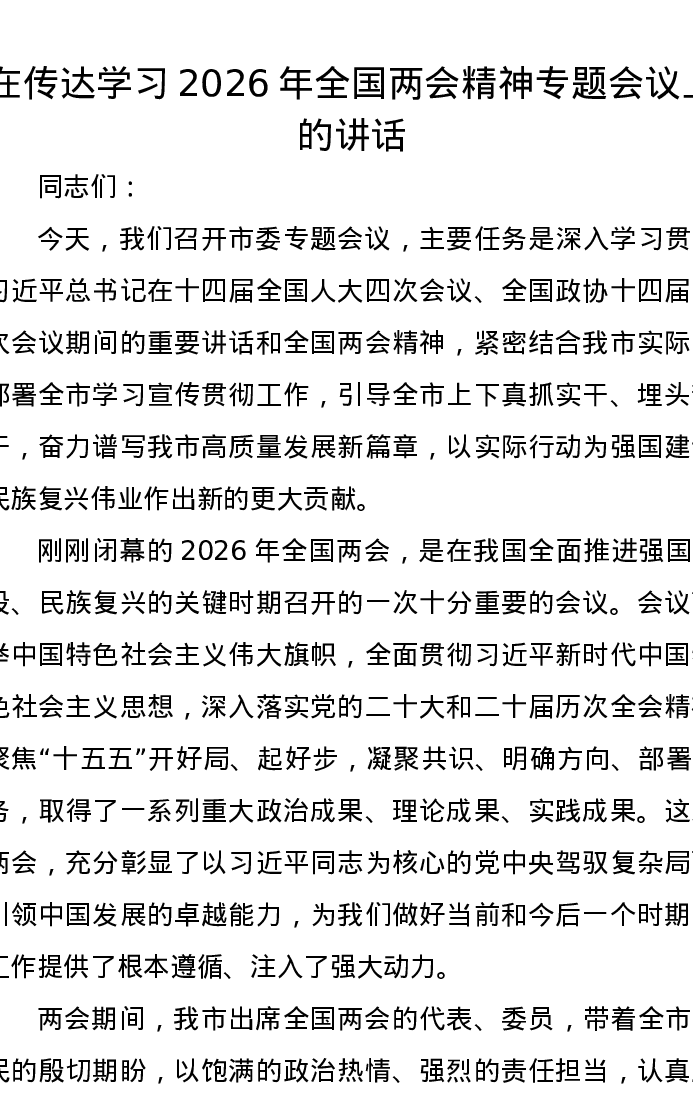 在传达学习2026年全国两会精神专题会议上的讲话