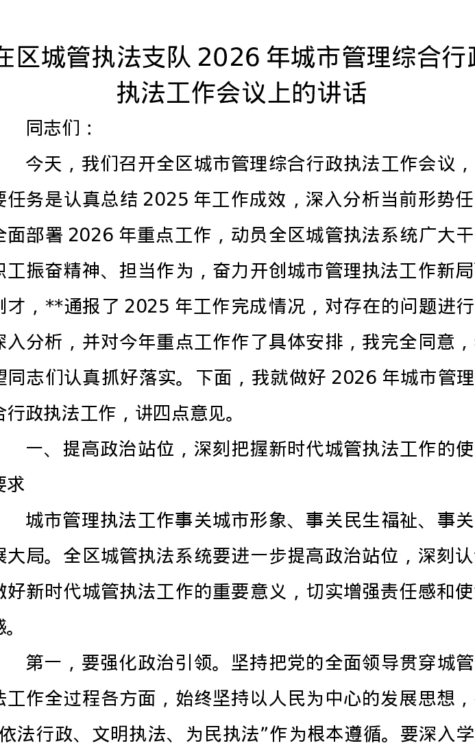 在区城管执法支队2026年城市管理综合行政执法工作会议上的讲话