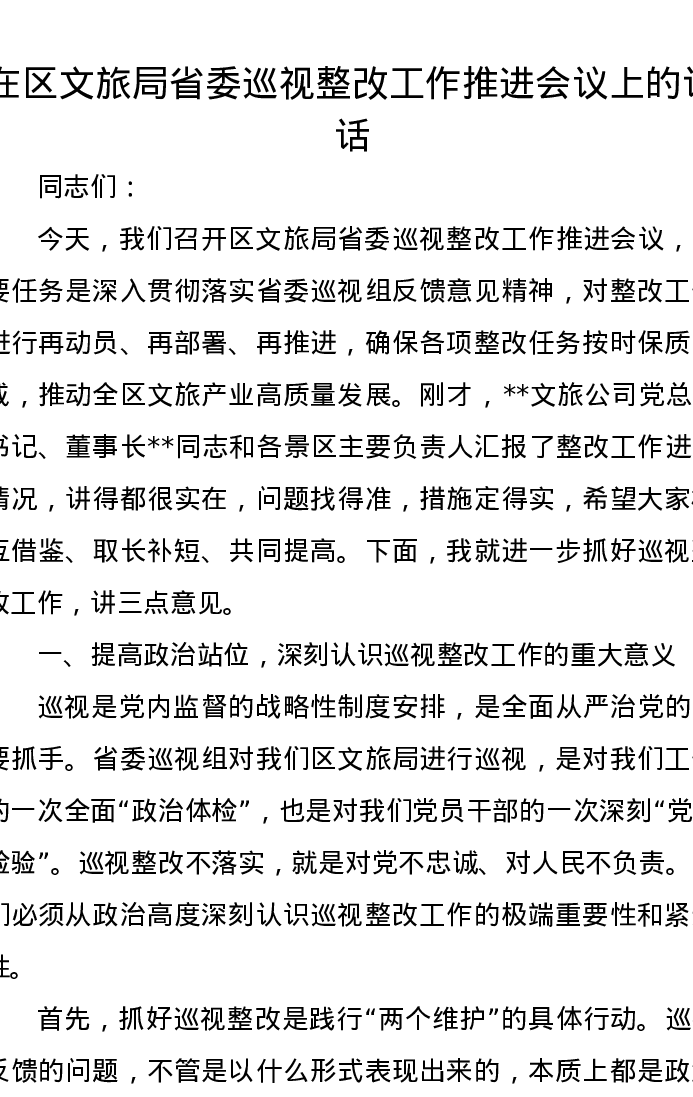 在区文旅局省委巡视整改工作推进会议上的讲话