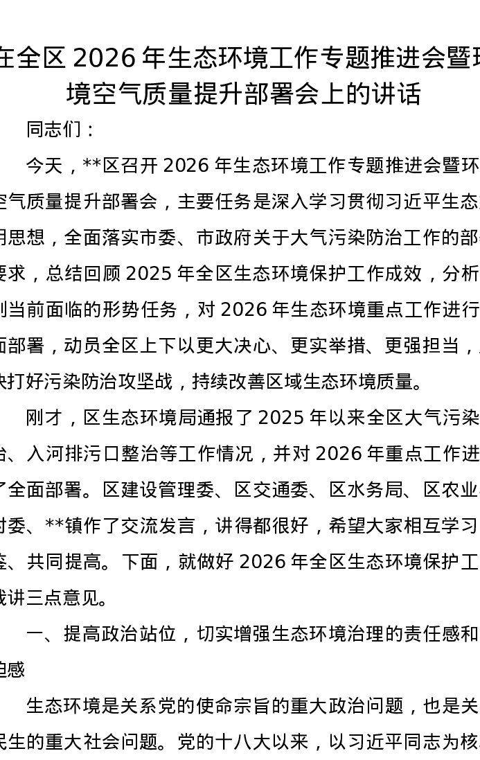在全区2026年生态环境工作专题推进会暨环境空气质量提升部署会上的讲话