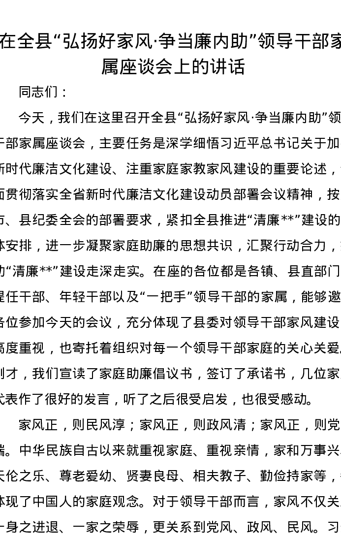 在全县弘扬好家风·争当廉内助领导干部家属座谈会上的讲话