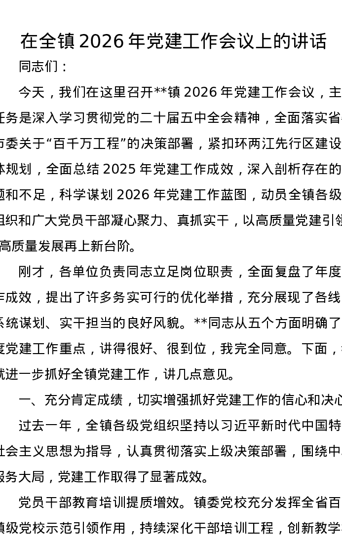 在全镇2026年党建工作会议上的讲话