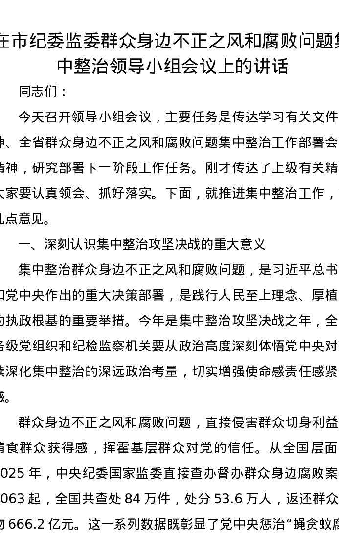 在市纪委监委群众身边不正之风和腐败问题集中整治领导小组会议上的讲话