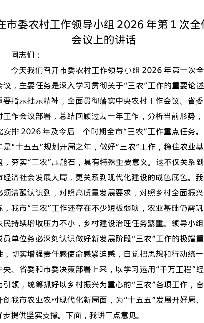 在市委农村工作领导小组2026年第1次全体会议上的讲话