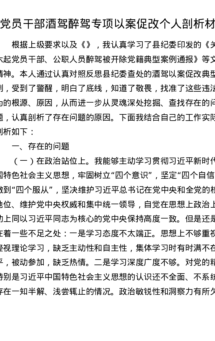 拒绝酒驾醉驾以案促改个人剖析材料