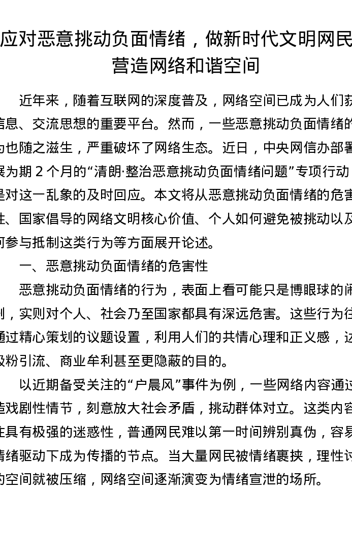 应对恶意挑动负面情绪,做新时代文明网民,营造网络和谐空间