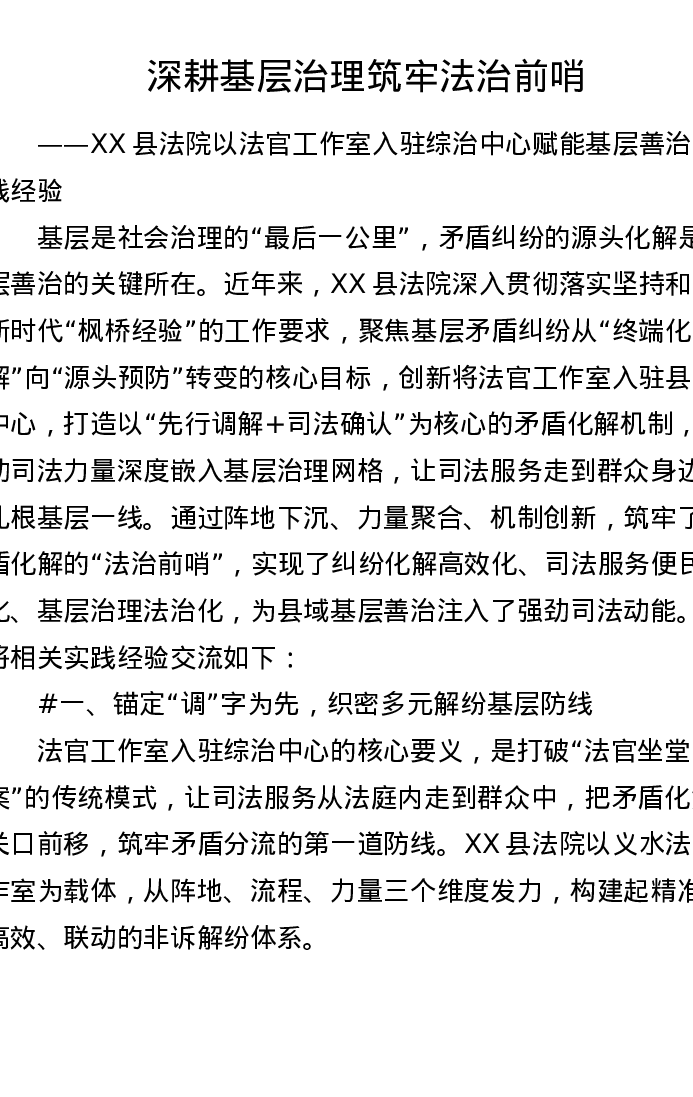 XX县法院以法官工作室入驻综治中心赋能基层善治的实践经验