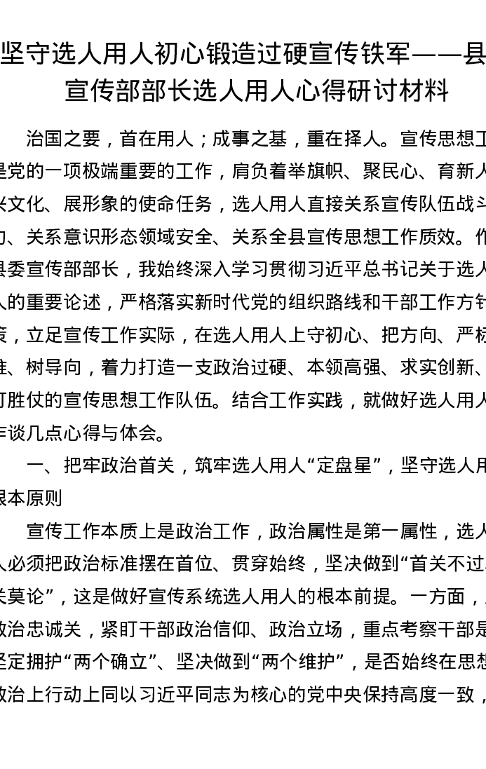坚守选人用人初心 锻造过硬宣传铁军——县委宣传部部长选人用人心得研讨材料