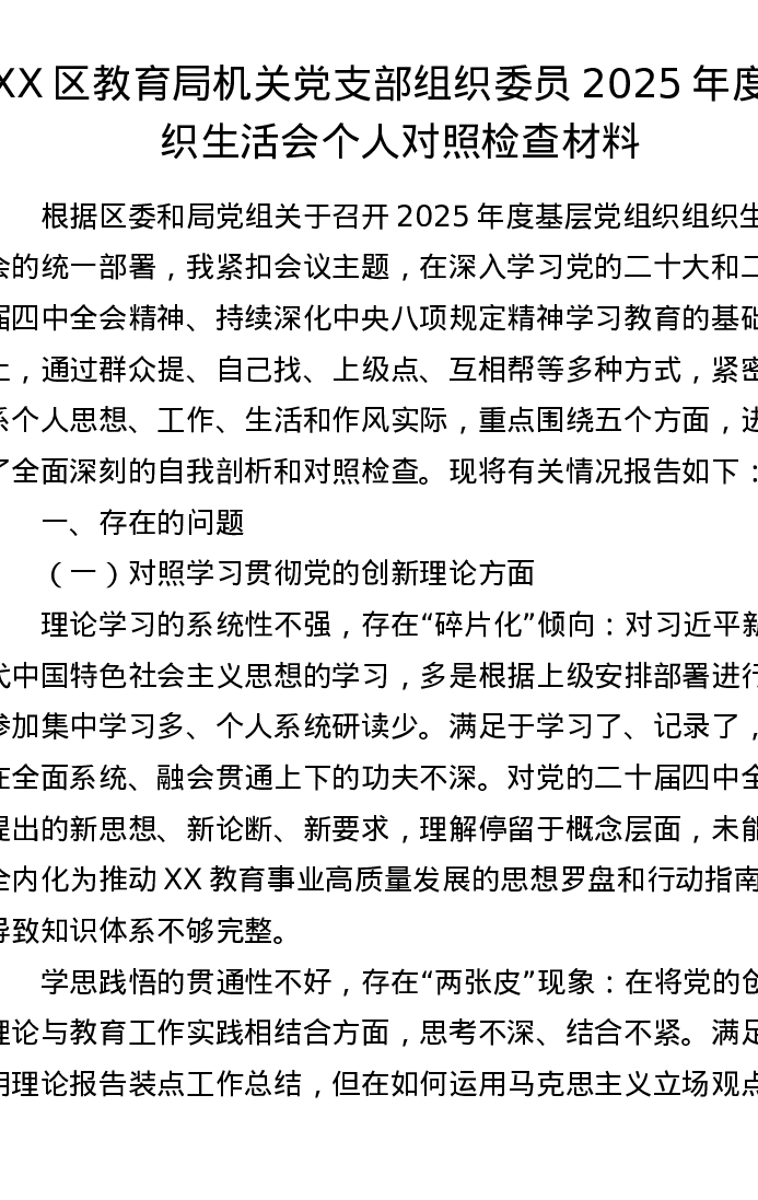 XX区教育局机关党支部组织委员2025年度组织xxx个人对照检查材料
