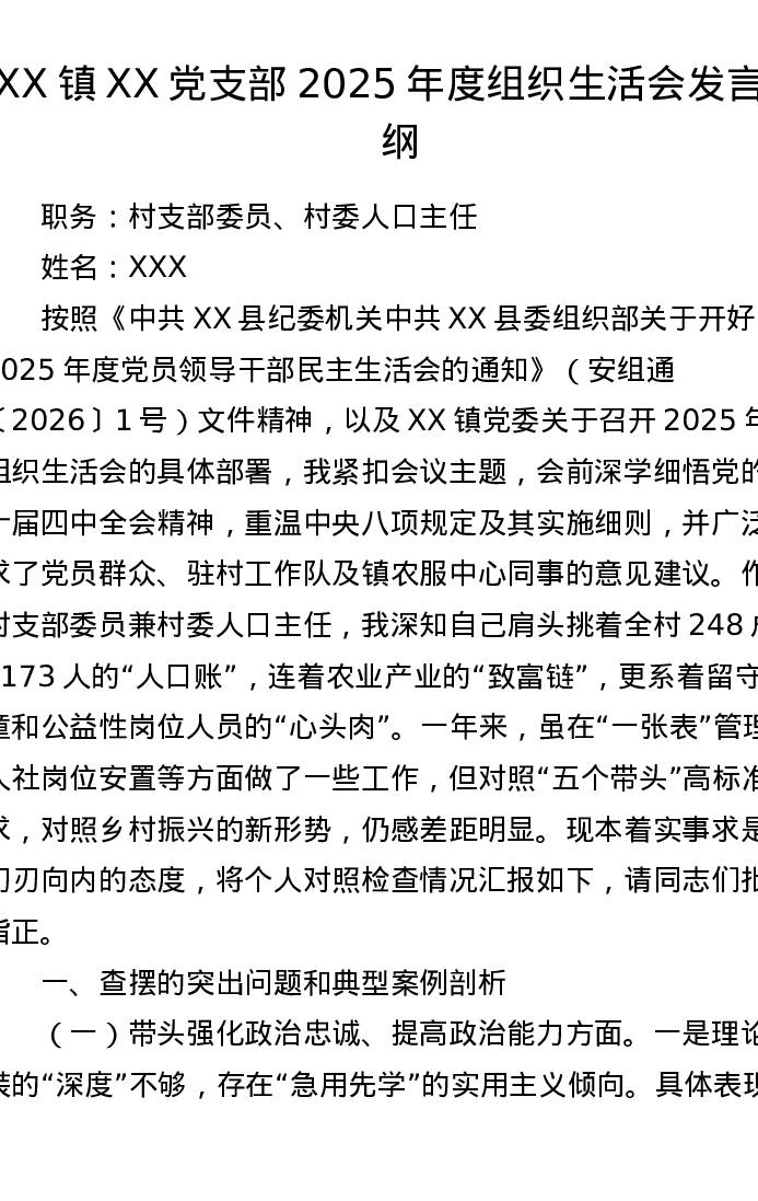 XX镇XX党支部2025年度组织xxx发言提纲2